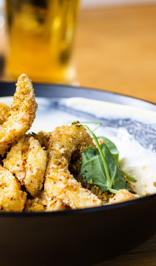 Tempura battered market fish, grilled tiger prawn, hand-cut agria fries, slaw, and home-made tartare sauce (df/gfo)
